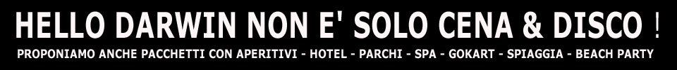 scegli il tuo programma, clicca sul bottone giallo HELLO DARWIN vi informa, che tutti sabato sera saranno presenti comitive femminili e rispettive festeggiate (future spose, laureate, o compleanni), con le quali il vostro festeggiato (sposo, laureato, compleanno) potrą interagire, partecipando alle sfide e scherzi dettati dal nostro programma artistico e dai nostri animatori/animatrici e artisti.